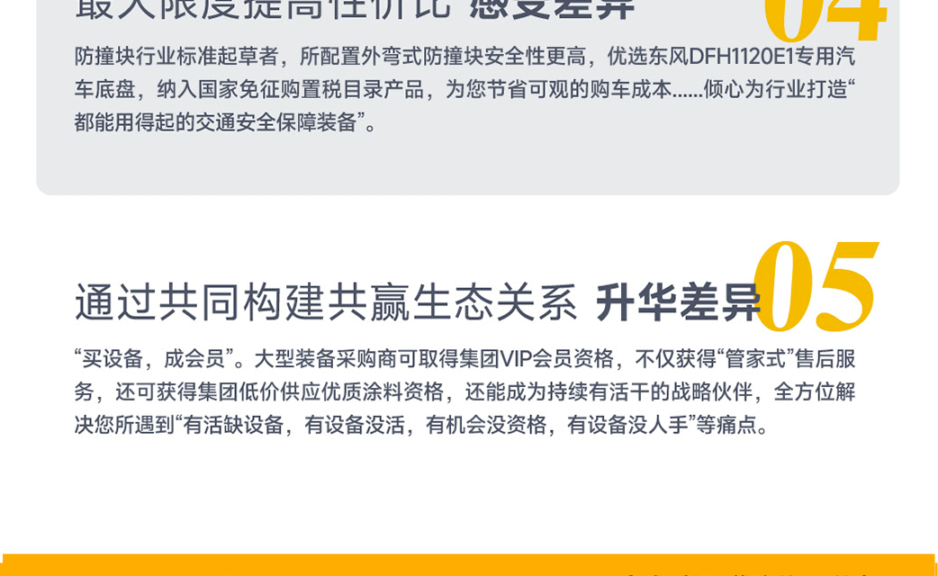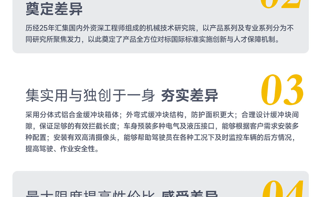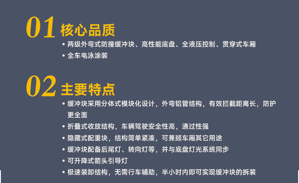 ?專家測評:主要特點緩沖塊采用分體式模塊化設計,外彎鋁管結構,有效攔截距離長,防護更全面;折疊式收放結構,車輛駕駛安全性高,通過性強;隱藏式配重塊,結構簡單緊湊,可兼顧車廂其它用途; 緩沖塊配備后尾燈、轉向燈等,并與底盤燈光系統同步;可升降式箭頭引導燈;極速裝卸結構,無需行車輔助,半小時內即可實現緩沖塊的拆裝 ;