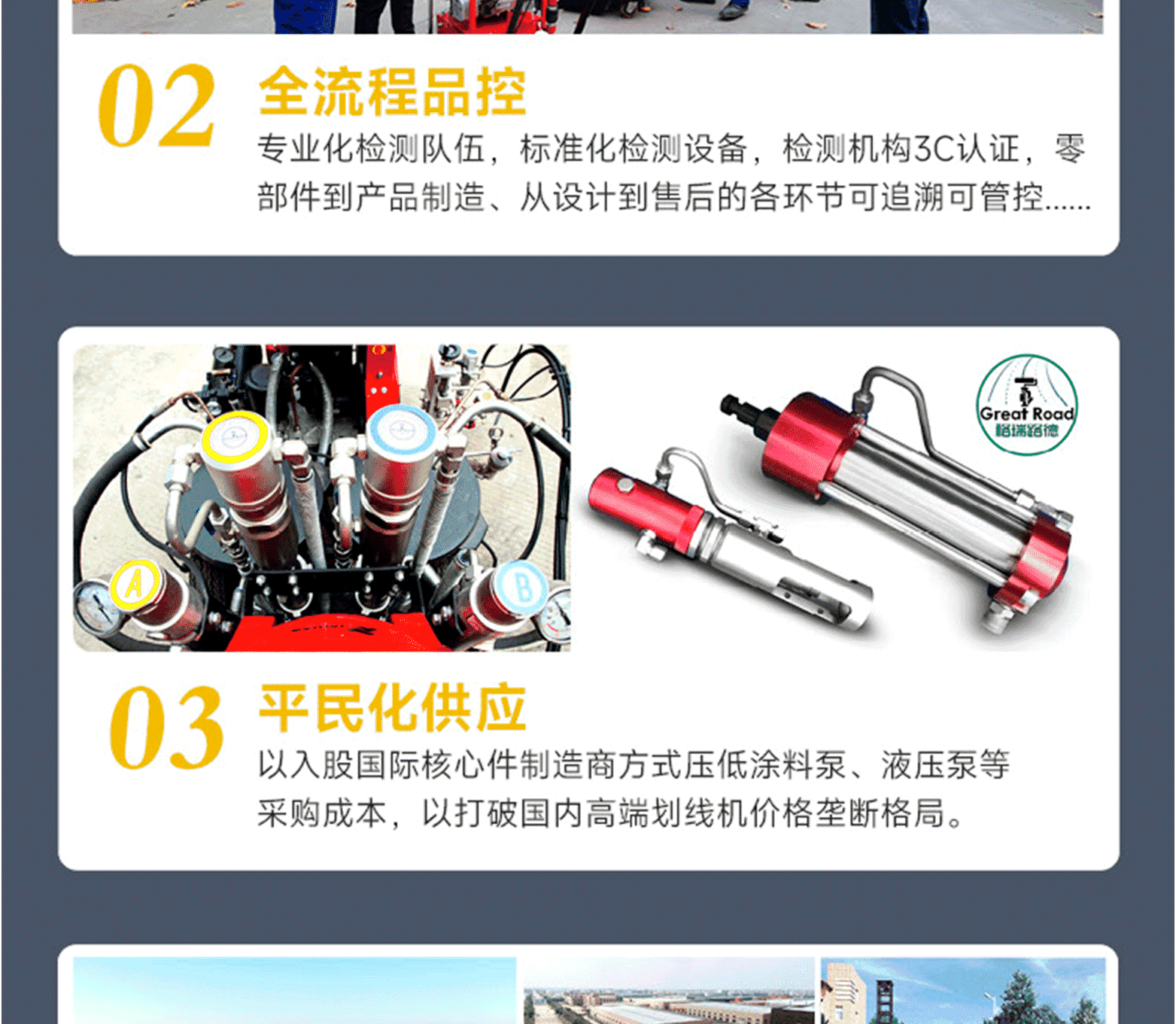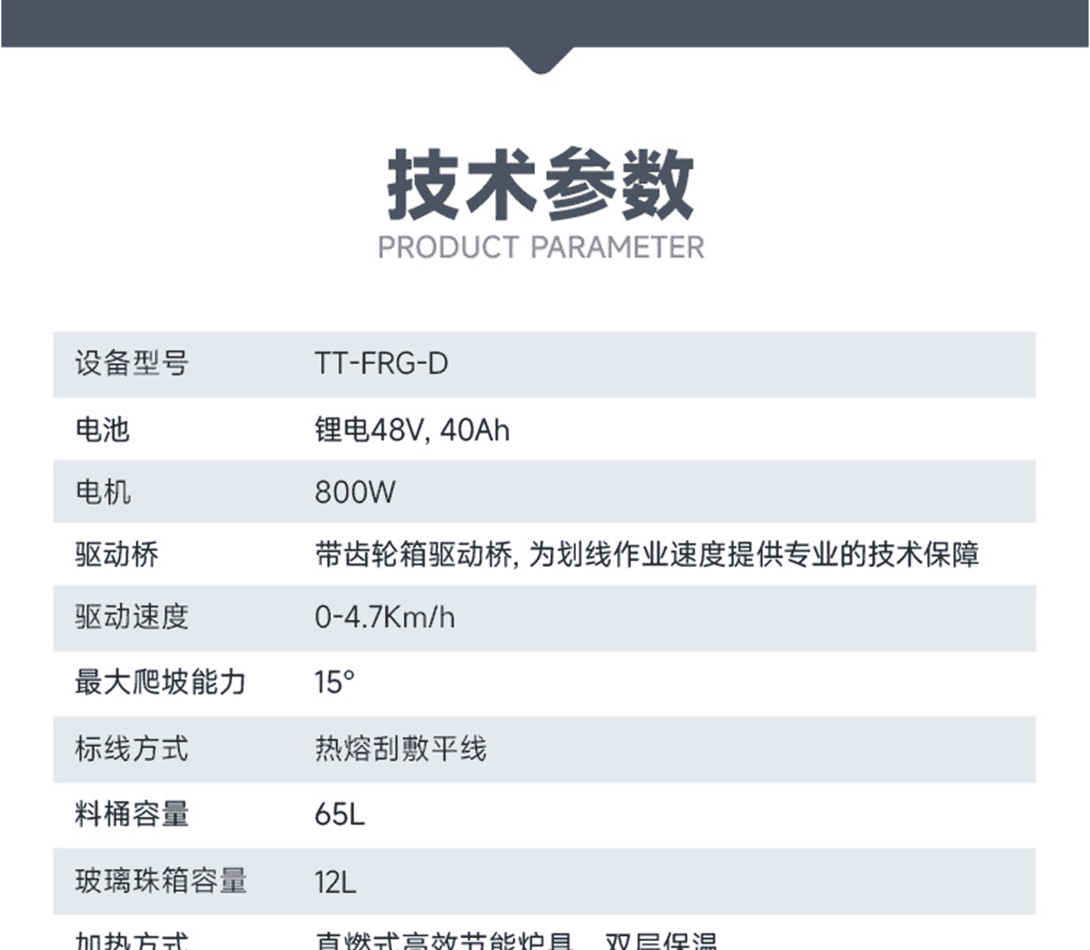 主要特點:刮敷施工,線型整齊美觀,結構簡單易維護。大功率電機,坡道劃線線型穩定整齊。大功率鋰電池,環保,續航能力強