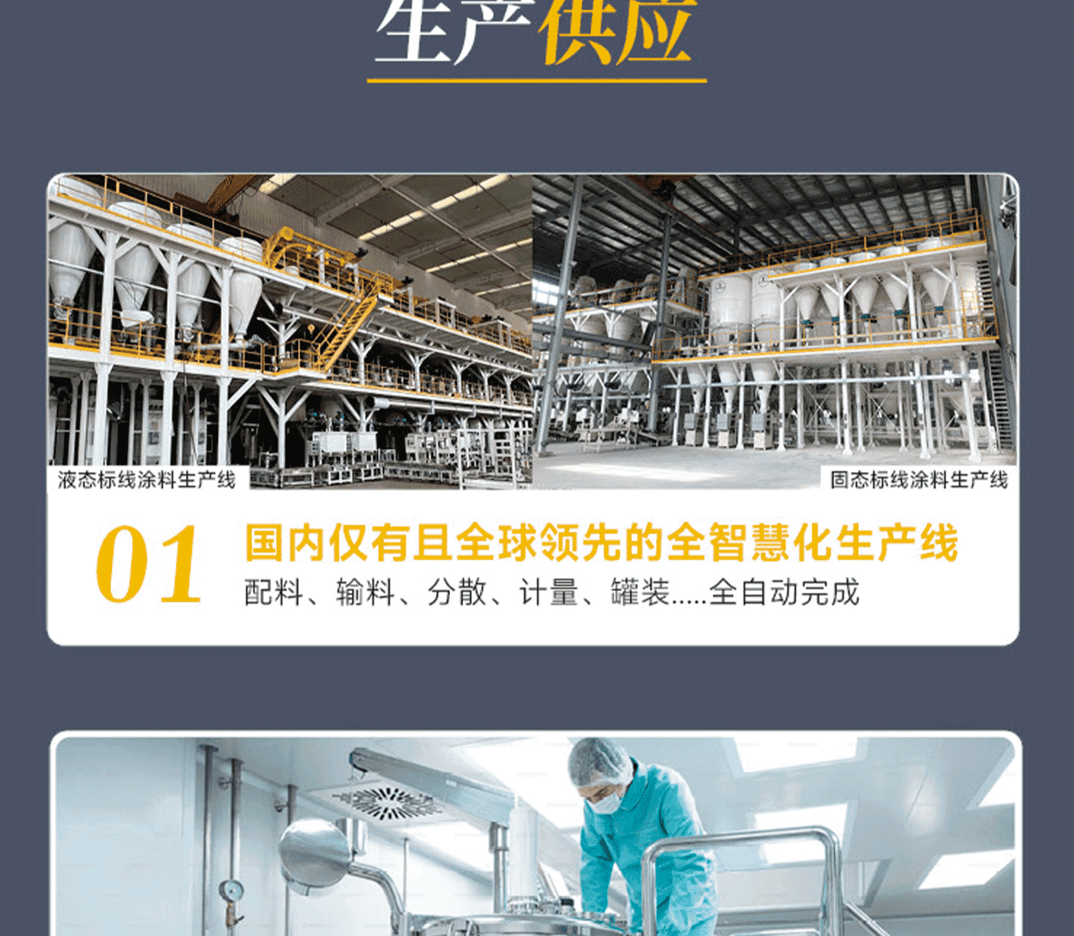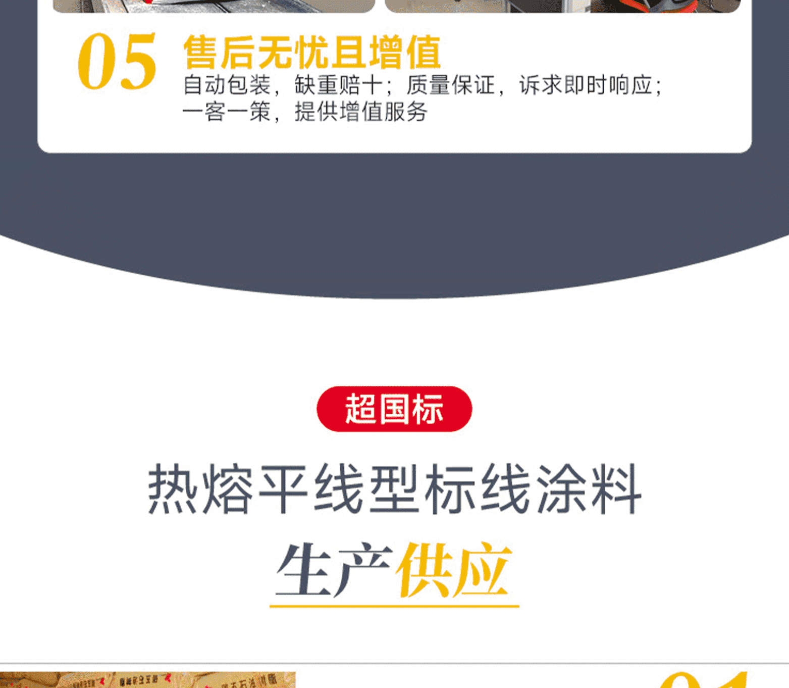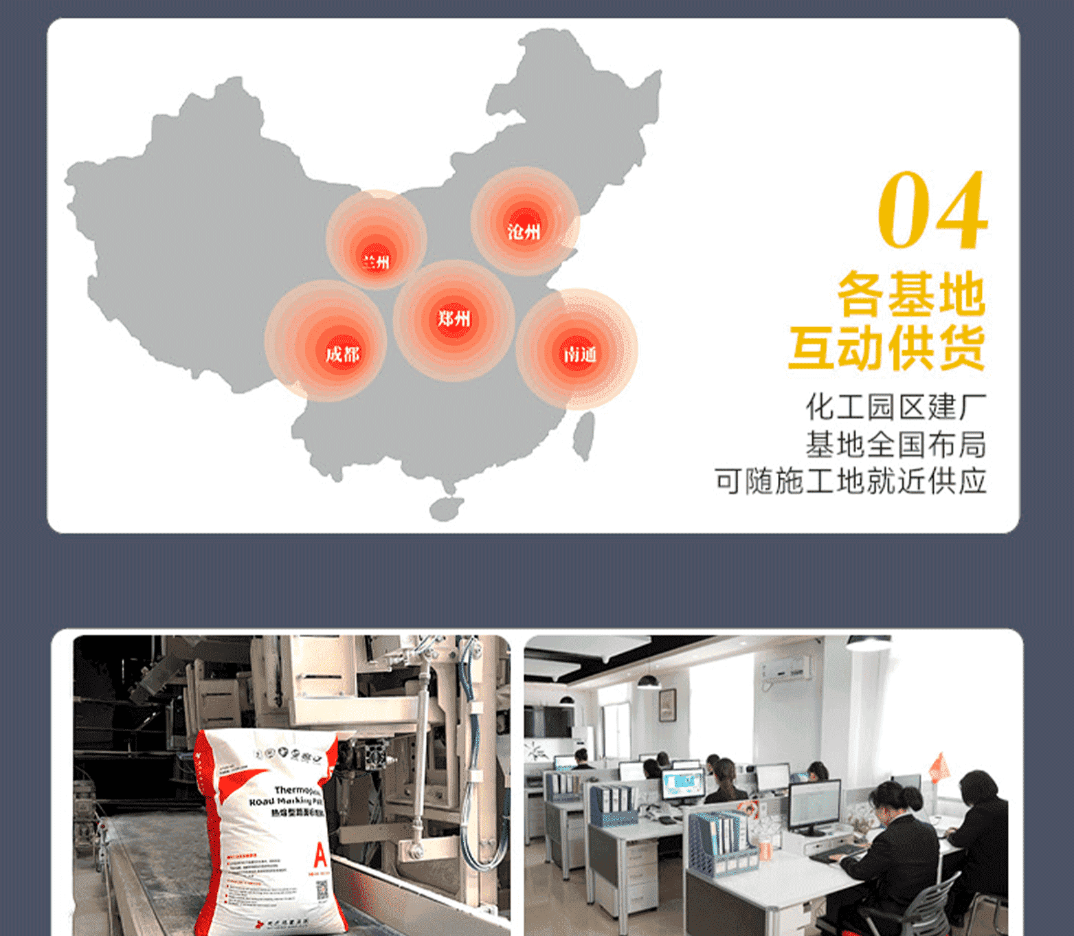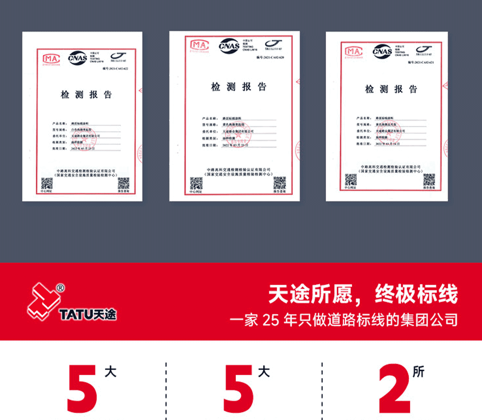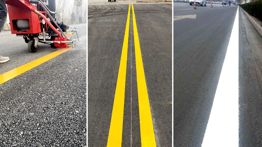 涂料特點:結構密實不開裂,抗壓耐磨不黃變、卓越的識認性、對路面玻璃珠粘接力強。標線特點:表面平滑顏色鮮艷;密實耐磨反光好;不龜裂、不黃變,質量免檢;標線壽命長,是常規熱熔標線的1.6倍。