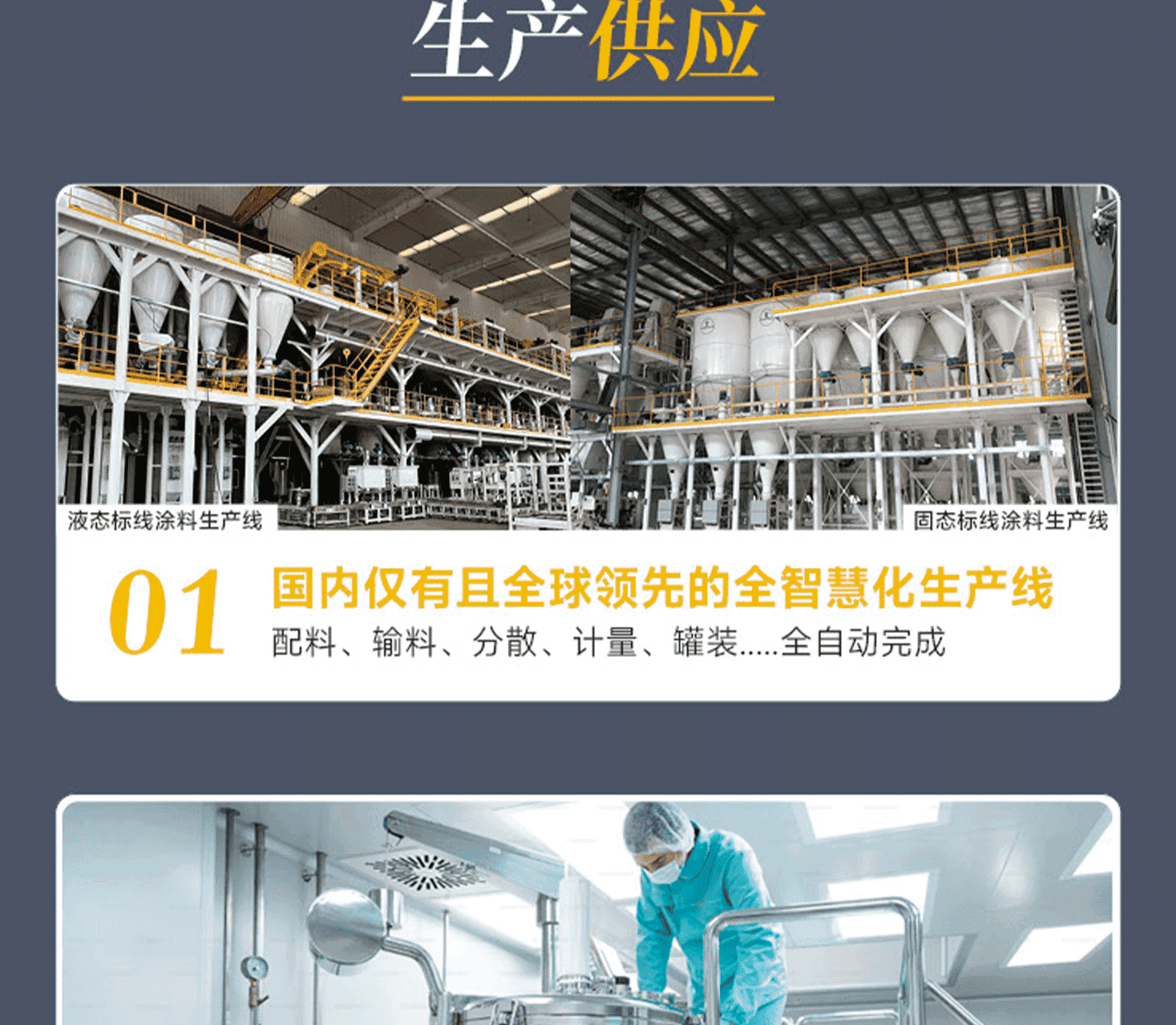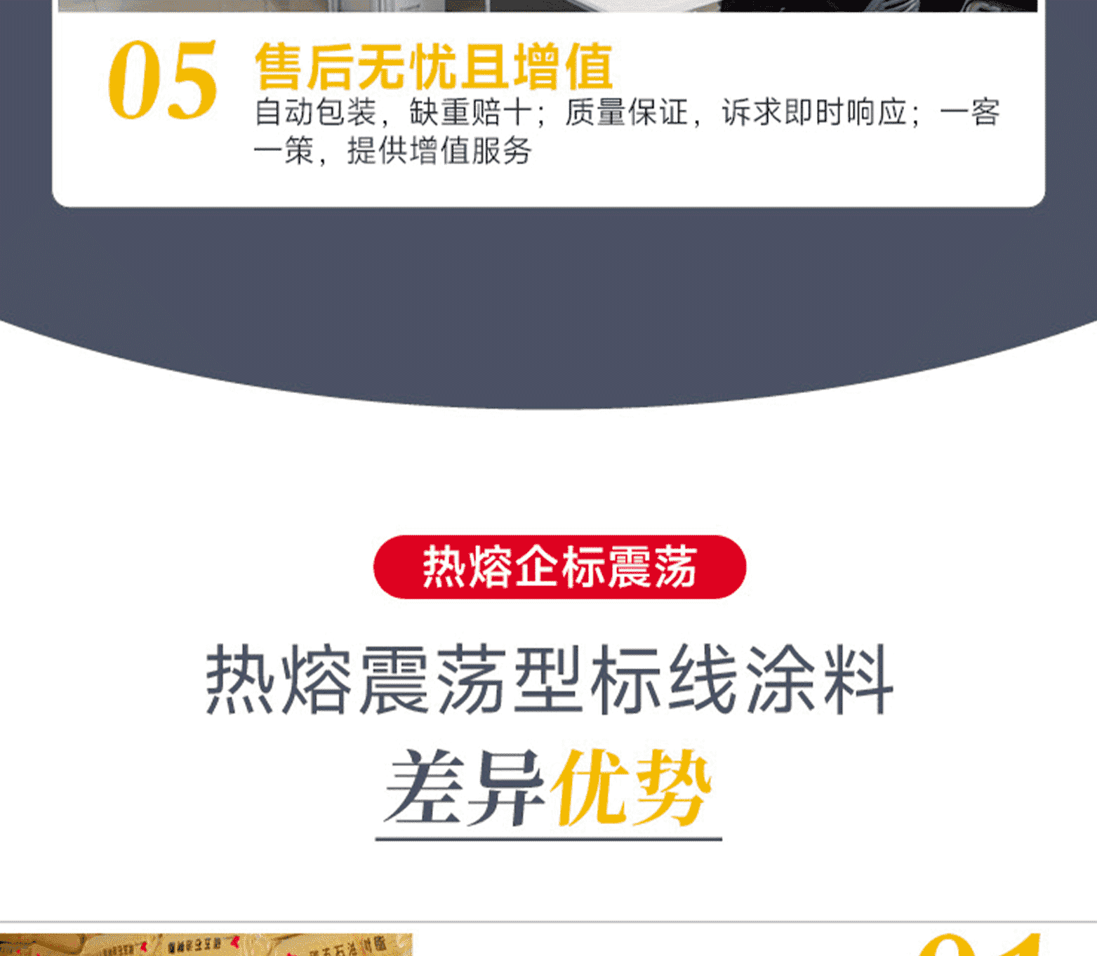 涂料特點:結構合理、混合均勻、質量一致性高 / 玻璃珠含量少 / 用途廣泛,使用方便。標線特點:表面平滑顏色鮮艷;密實耐磨反光好;不龜裂、不黃變,質量免檢;
