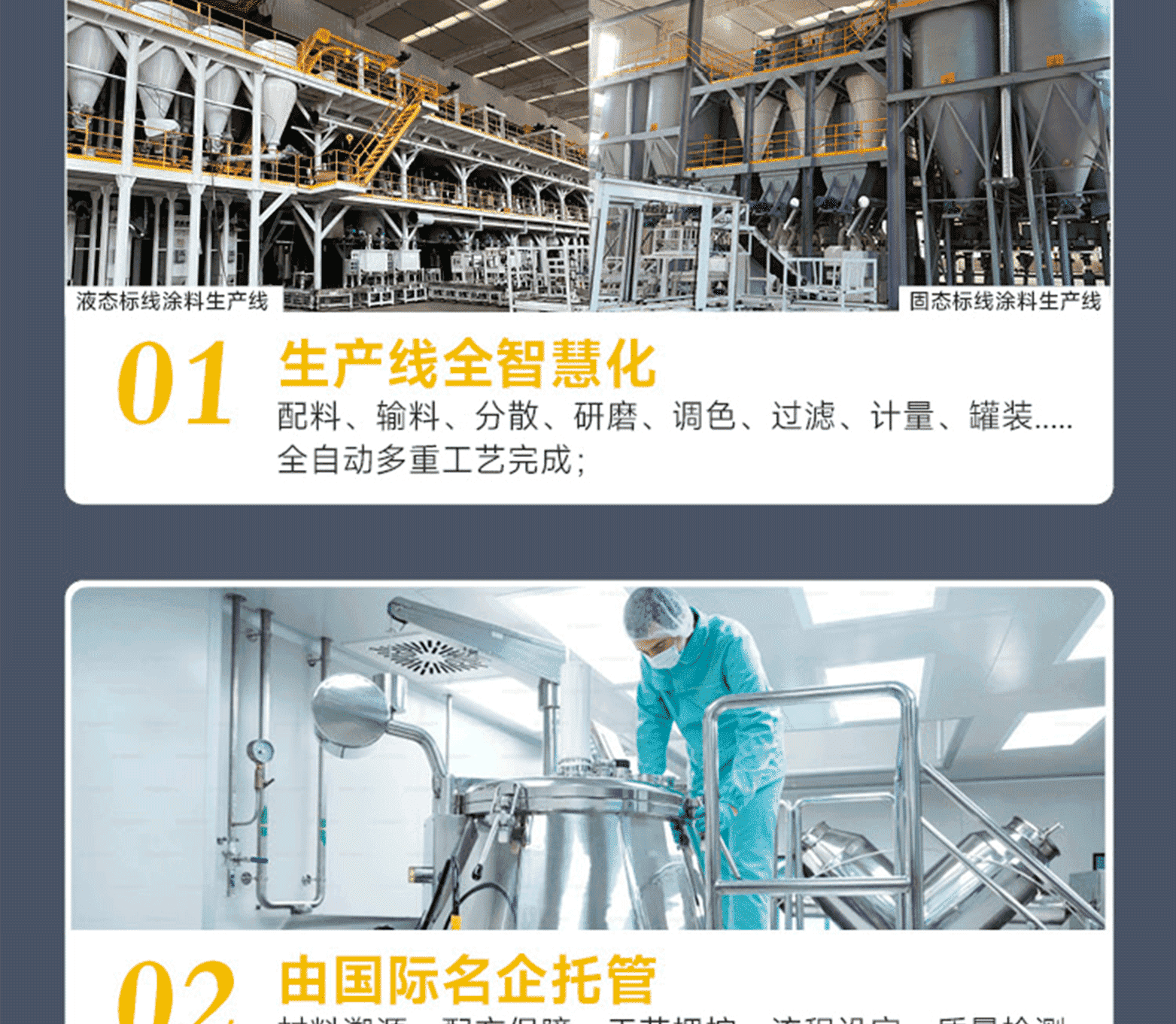 標線品質:進口基料、金紅石鈦白/有機鉻黃顏料、多重優質助劑、復合工藝、標準化檢測;標線特點:色澤純正、覆蓋性高、施工性好、耐磨耐黃變、抗沉不起泡、品質一致性高;