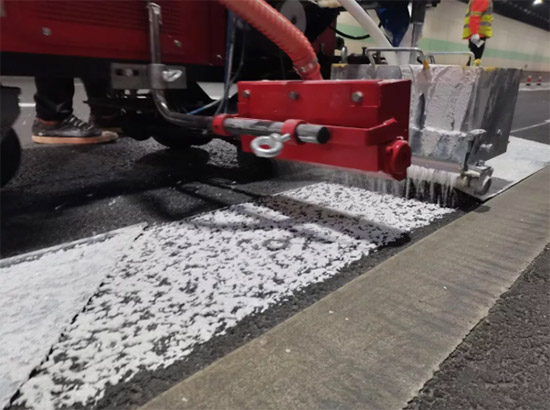 雙組份標線是一種環境友好型標線,其具有其它類型標線難于比擬的反光性、耐侯性及耐磨性,且整個生命周期內幾乎無粉塵磨耗,有效解決了傳統溶劑型標線施工時有溶劑揮發、使用過程不耐磨及反光效果差,以及熱熔型標線施工時耗費燃料、使用過程磨耗大量粉塵漂浮空氣中等弊端。